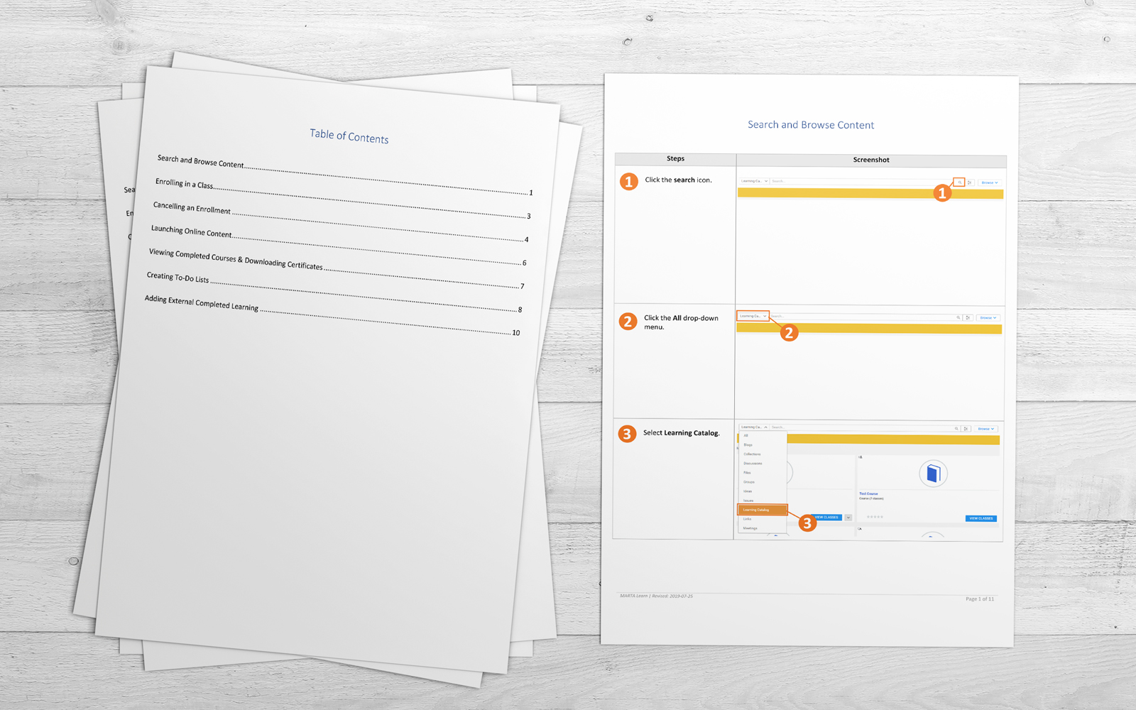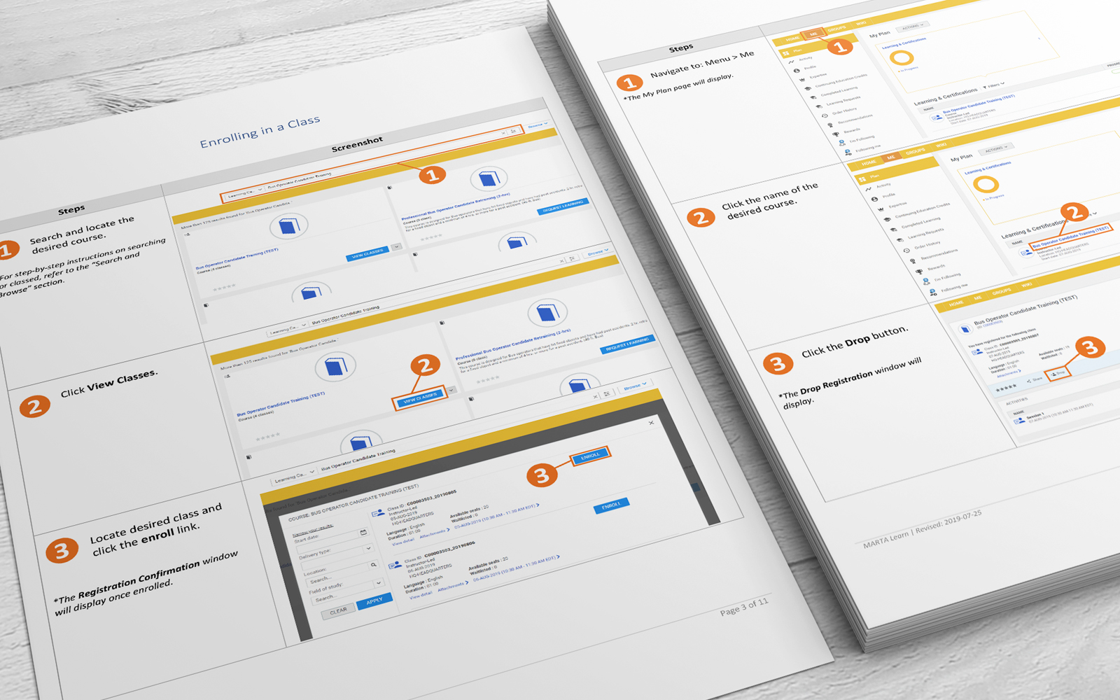In creating the learner quick reference guide, I wanted to design something that was colorful and easy to follow. I was able to use a split-column style grid so that the learner could see the action on the left and the screenshot reference on the right. This allowed learners to use the column that best represented their learning style and also allowed them to use both columns to get clarity about the steps needed to do a process.